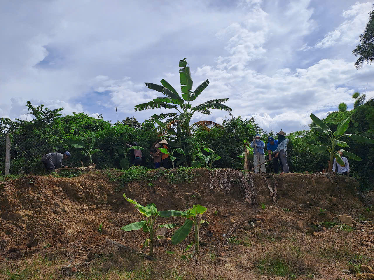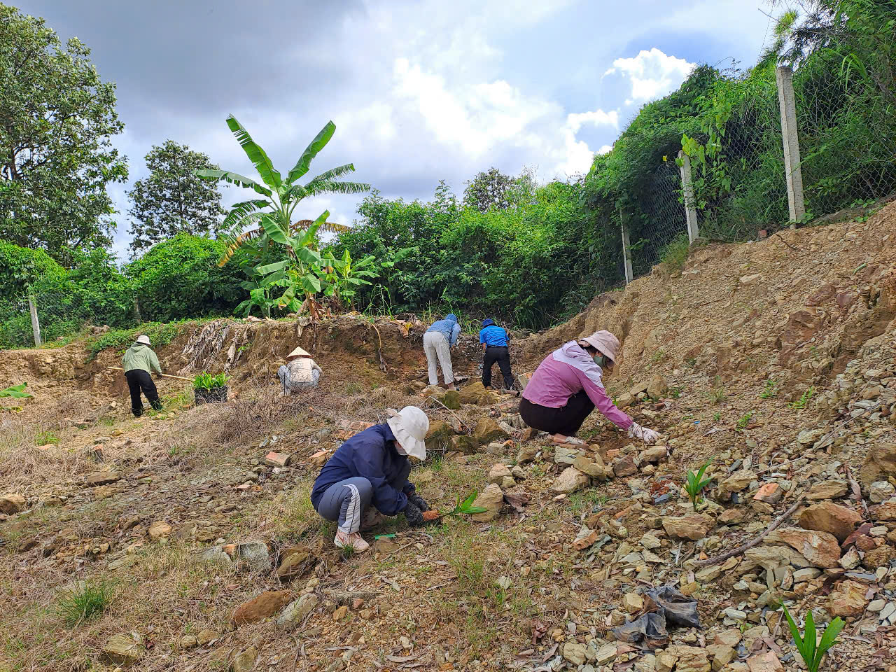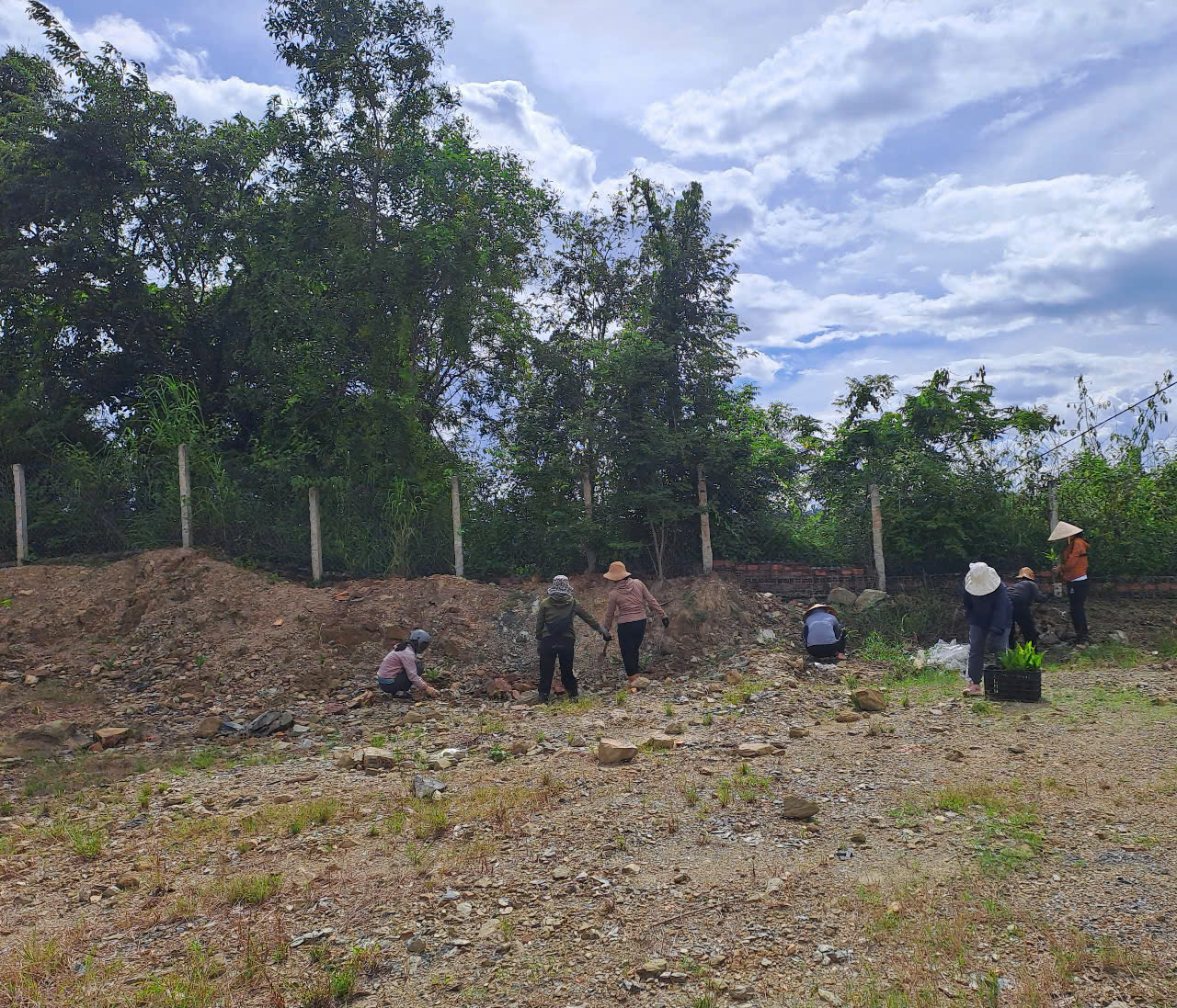 Tập thể CBGVNV cùng học sinh lao động trồng cây và dọn cỏ khuôn viên trường